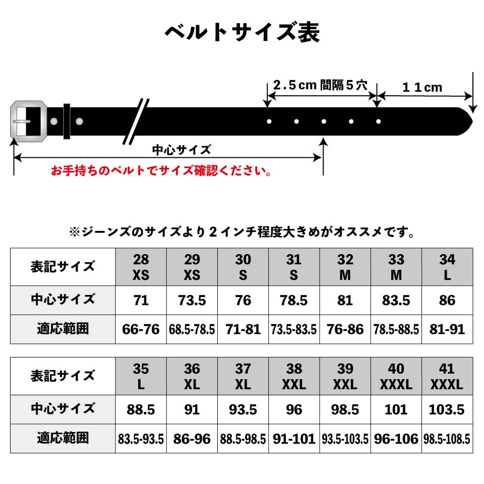 サイズについてはジーンズのサイズとは一致しませんので必ずお手持ちのベルトを計ってから決めて下さい。